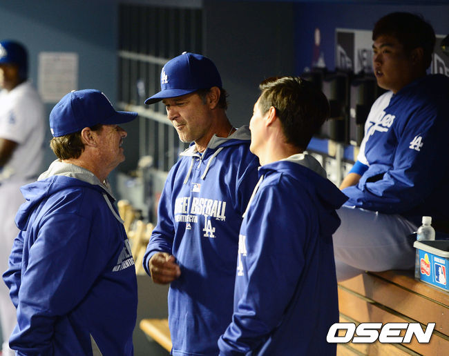 4회를 마친 다저스 선발 류현진과 얘기를 나눈 돈 매팅리 감독이 릭 허니컷 투수 코치와 얘기를 나누고 있다.
