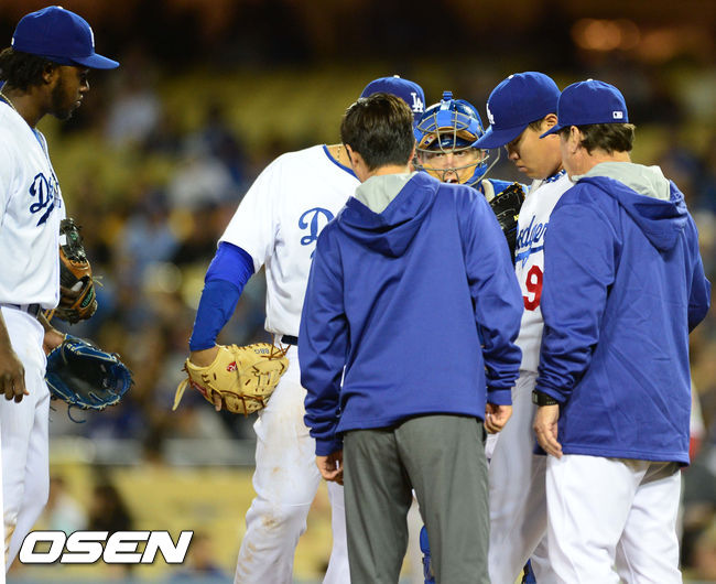 6회초 2사 주자 1,2루 필라델피아 롤린스 타석에서 LA 다저스 류현진이 릭 허니컷 코치와 얘기를 나누고 있다.