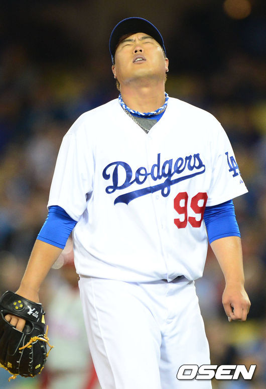 23일(이하 한국시간) 미국 캘리포니아주 로스앤젤레스 다저스타디움에서 열린 '2014 메이저리그' LA 다저스와 필라델피아 필리스의 경기, 6회초 2사 주자 1루 다저스 선발 류현진이 필라델피아 르비어의 타구를 잡아내지 못하고 아쉬워하고 있다.