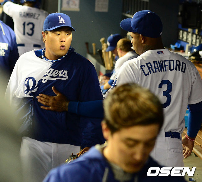 23일(이하 한국시간) 미국 캘리포니아주 로스앤젤레스 다저스타디움에서 열린 '2014 메이저리그' LA 다저스와 필라델피아 필리스의 경기, 6회를 마친 다저스 선발 류현진이 덕아웃으로 들어가며 크로포드의 격려를 받고 있다.