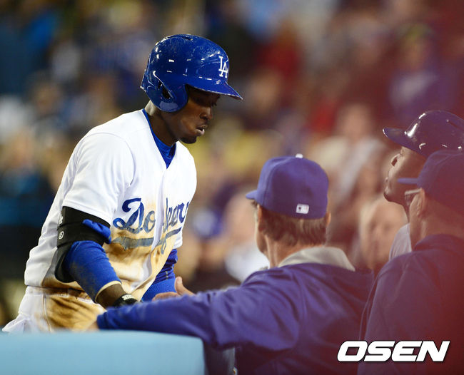 23일(이하 한국시간) 미국 캘리포니아주 로스앤젤레스 다저스타디움에서 열린 '2014 메이저리그' LA 다저스와 필라델피아 필리스의 경기, 7회말 2사 주자 3루 다저스 저스틴 터너의 좌전 동점 1타점 적시타때 홈을 밟은 3루 주자 디 고든이 덕아웃에서 동료들과 하이파이브를 하고 있다.