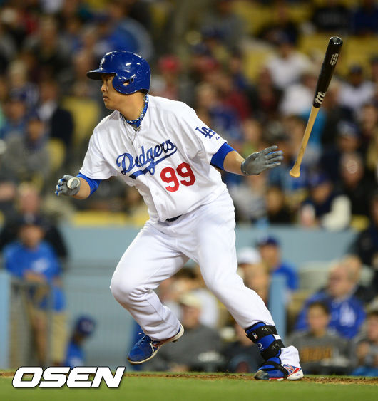 23일(이하 한국시간) 미국 캘리포니아주 로스앤젤레스 다저스타디움에서 열린 '2014 메이저리그' LA 다저스와 필라델피아 필리스의 경기, 2회말 2사 주자 2루 다저스 류현진이 유격수 땅볼타구를 날리고 있다.