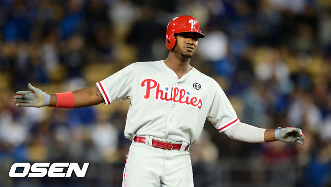 23일(이하 한국시간) 미국 캘리포니아주 로스앤젤레스 다저스타디움에서 열린 '2014 메이저리그' LA 다저스와 필라델피아 필리스의 경기, 연장 10회초 1사 주자 2루 필라델피아 브라운이 좌중간 1타점 결승타를 날린 후 2루에서 기뻐하고 있다.