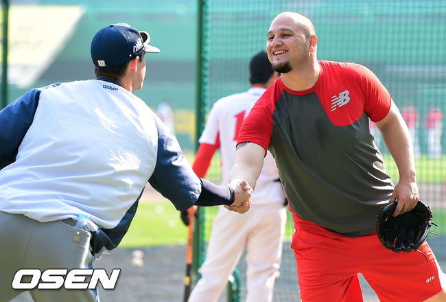 23일 오후 인천 문학구장에서 열린 2014 한국야쿠르트 세븐 프로야구 SK 와이번스와 NC 다이노스의 경기에 앞서 SK 레이예스가 NC 새용병 투수 웨버와 악수를 나누고 있다.