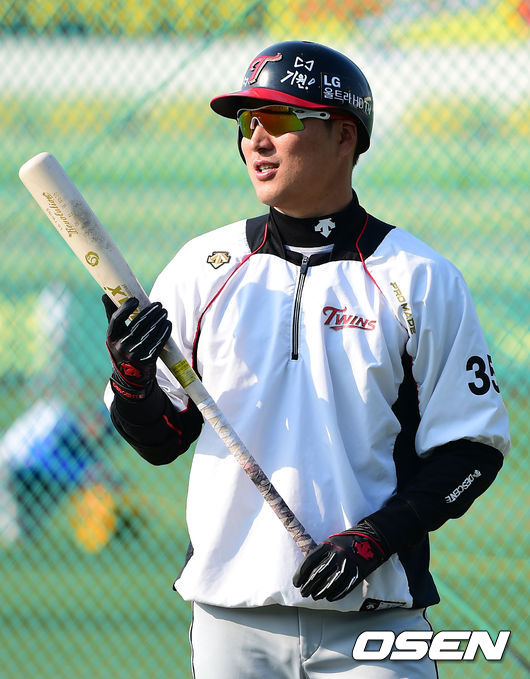 경기에 앞서 LG 이진영이 세월호 실종자들의 무사생환 기원 문구가 적힌 헬멧을 쓰고 훈련을 하고 있다.