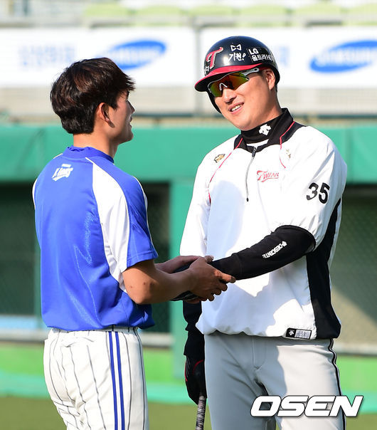 경기에 앞서 LG 이진영이 삼성 김상수와 인사를 나누고 있다.