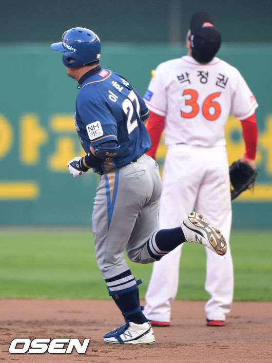 23일 오후 인천 문학구장에서 열린 2014 한국야쿠르트 세븐 프로야구 SK 와이번스와 NC 다이노스의 경기, 1회초 2사 1루 NC 이호준이 선취 2점 홈런을 날리고 베이스를 돌고 있다.