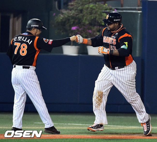 4회초 2사 우중월 투런홈런을 날린 히메네스가 3루를 밟으며 모토니시 코치와 하이파이브를 하고 있다.