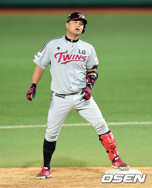 4초 2사 1,2루에서 LG 최경철이 중전 적시타를 치고 1루에서 타임을 외치고 있다.
