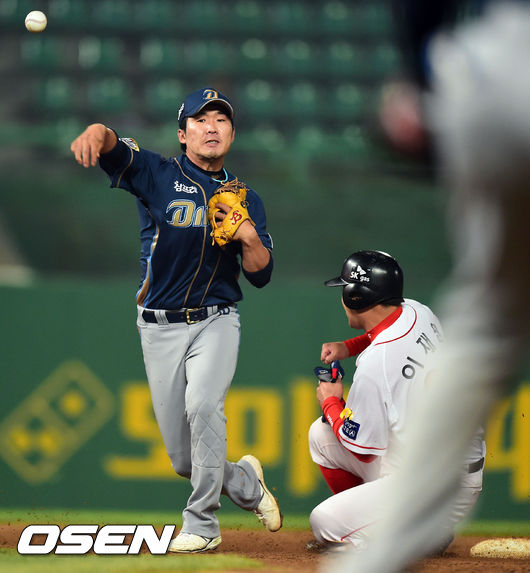 23일 오후 인천 문학구장에서 열린 2014 한국야쿠르트 세븐 프로야구 SK 와이번스와 NC 다이노스의 경기, 4회말 1사 1,2루 SK 나주환의 병살타때 NC 지석훈 유격수가 1루 주자 이재원을 포스아웃 시킨후 1루로 송구하고 있다.