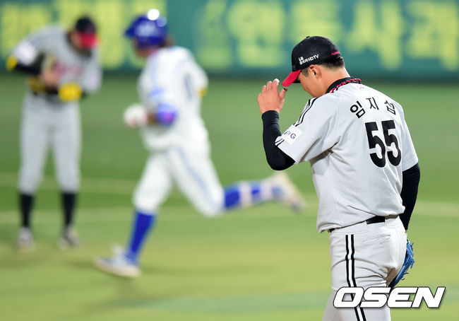 4말 무사에서 삼성 박석민에게 좌월 솔로 홈런을 허용한 LG 임지섭이 아쉬워하고 있다.