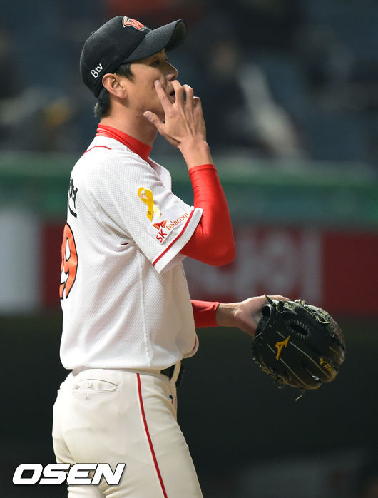 23일 오후 인천 문학구장에서 열린 2014 한국야쿠르트 세븐 프로야구 SK 와이번스와 NC 다이노스의 경기,4회초 이종욱의 희생플라이로 실점 허용한 SK선발투수 김광현이 아쉬워하고 있다.