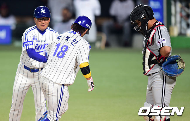 4말 무사에서 삼성 박석민이 좌월 솔로 홈런을 치고 홈에서 김평호 코치와 하이파이브를 하고 있다.