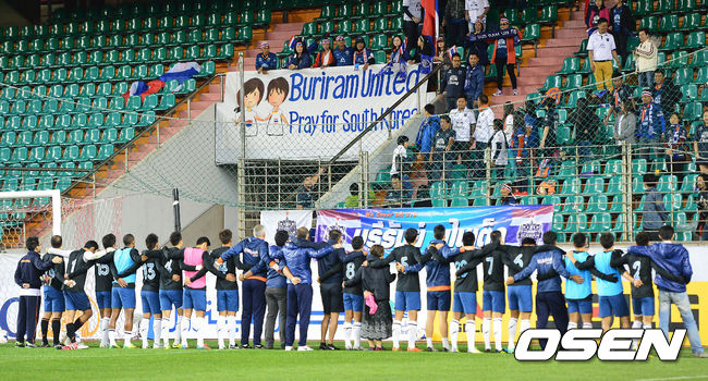 세월호 침몰 희생자를 추모하고 실종자의 무사생환을 기원하는 태국 부리람 팬들의 플랜카드가 걸려 있는 가운데 선수들이 팬들과 인사를 나누고 있다.