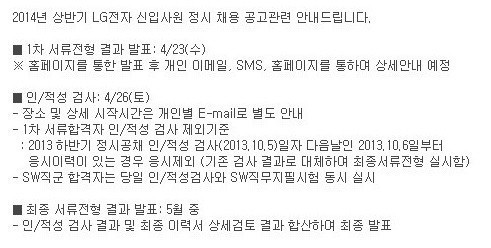 그러나 2013년 하반기 LG전자 채용에 지원해 인적성시험에 통과한 경험자는 기존 검사 결과로 대체된다고 덧붙였다.
