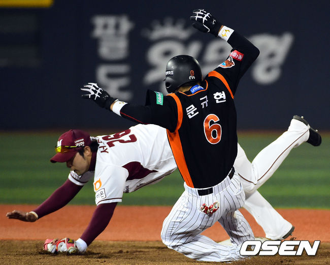 8회초 1사 주자 1루 롯데 김문호의 1루수 앞 땅볼 때 1루주자 문규현이 2루에서 넥센 서건창에게 터치아웃 되고 있다.