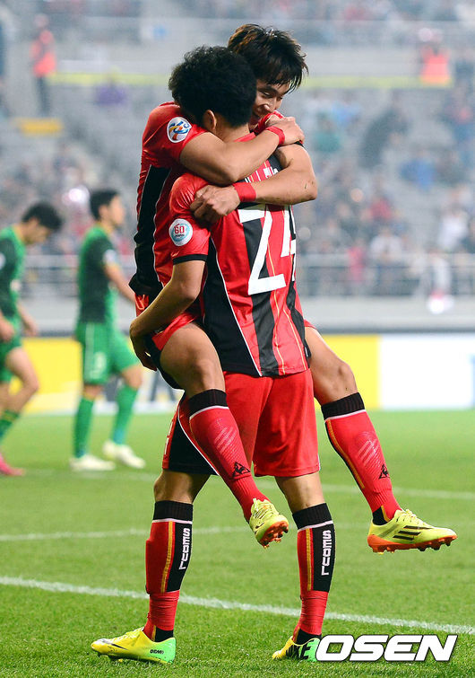 23일 오후 서울 월드컵경기장에서 열린 2014 AFC 챔피언스리그 F조 조별리그 최종전 FC 서울과 베이징 궈안의 경기 후반 윤주태가 골을 넣고 윤일록과 포옹을 하고 있다.