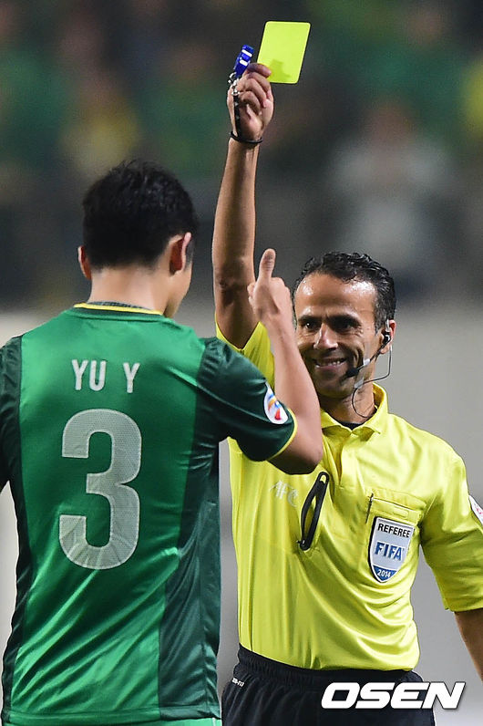 23일 오후 서울 월드컵경기장에서 열린 2014 AFC 챔피언스리그 F조 조별리그 최종전 FC 서울과 베이징 궈안의 경기 후반 베이징 위 양이 경고를 받고 있다.