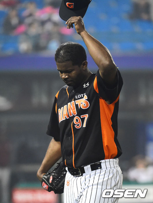 8회말 무사1루 상황에서 롯데 선발 유먼이 마운드를 내려오며 홍성민과 교체되고 있다.