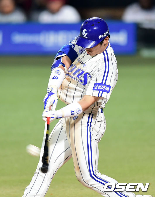 6회초 무사 3루에서 삼성 이영욱이 좌중간을 가르는 적시타를 치고 있다.