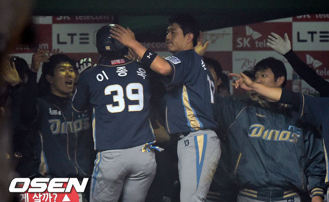 23일 오후 인천 문학구장에서 열린 2014 한국야쿠르트 세븐 프로야구 SK 와이번스와 NC 다이노스의 경기, 7회초 NC 선두타자 이종욱이 솔로홈런을 날리고 동료들의 축하를 받고 있다.