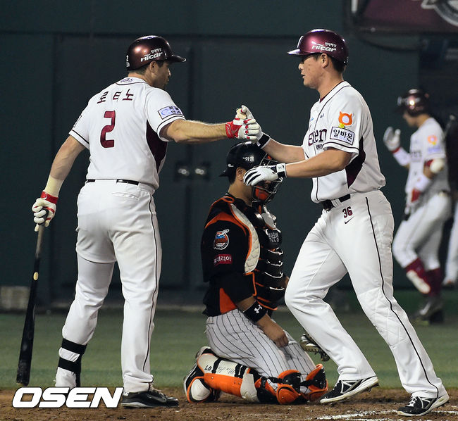 8회말 무사 주자없는 상황에서 우월 솔로 홈런을 날린 넥센 이성열이 홈을 밟으며 로티노와 하이파이브를 나누고 있다.