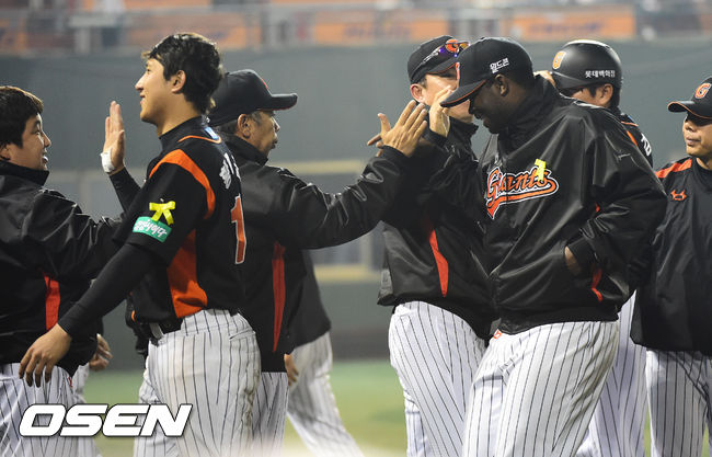 경기종료, 롯데 유먼이 코치들과 하이파이브를 나누고 있다. /ouxou@osen.co.kr