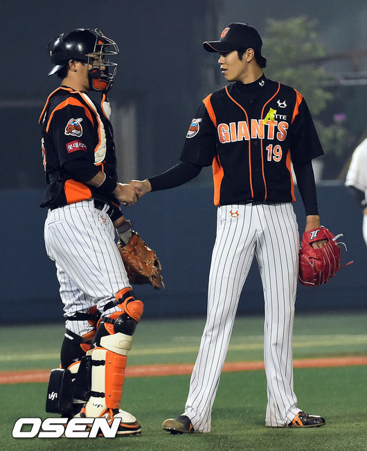 경기종료, 승리한 롯데 장성우와 홍성민이 인사를 나누고 있다. /ouxou@osen.co.kr