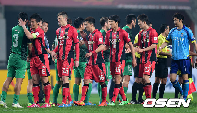 23일 오후 서울 월드컵경기장에서 열린 2014 AFC 챔피언스리그 F조 조별리그 최종전 FC 서울과 베이징 궈안의 경기 종료 후 선수들이 인사를 나누고 있다.