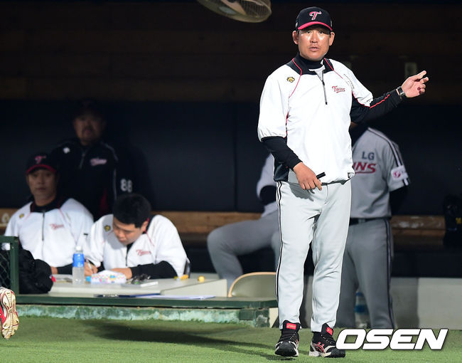 8회초 LG 조계현 코치가 선수 교체 사인을 하고 있다.