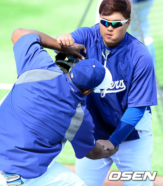 경기에 앞서 다저스 류현진과 유리베가 장난을 치고 있다.