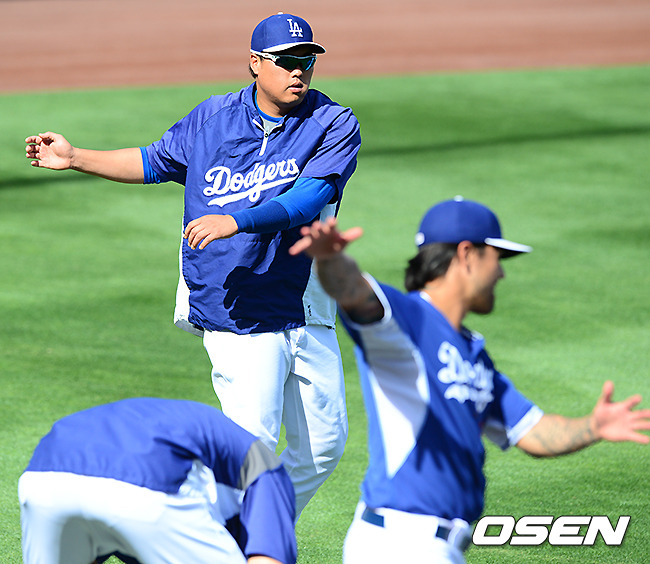 경기에 앞서 다저스 류현진이 몸을 풀고 있다.