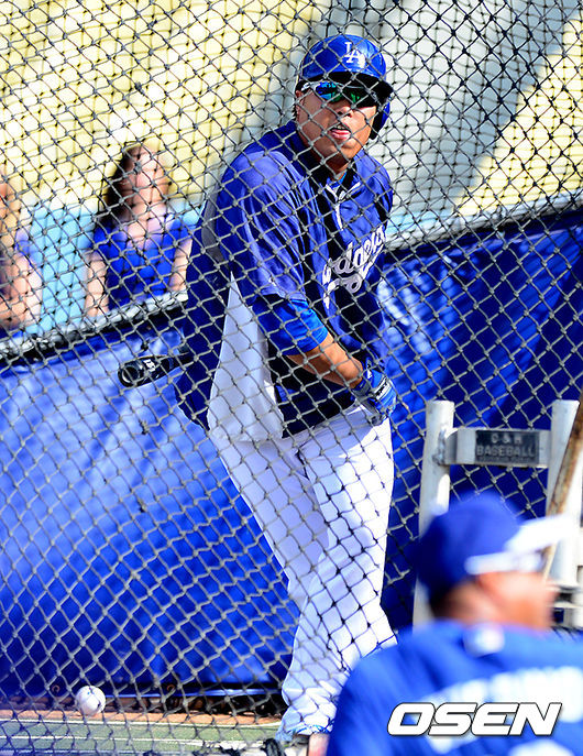 경기에 앞서 다저스 류현진이 타격 훈련을 하며 헛스윙하고 멋쩍어 하고 있다.