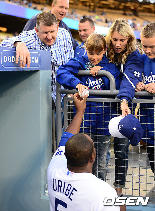경기에 앞서 다저스 유리베가 팬들에게 사인을 해주고 있다.