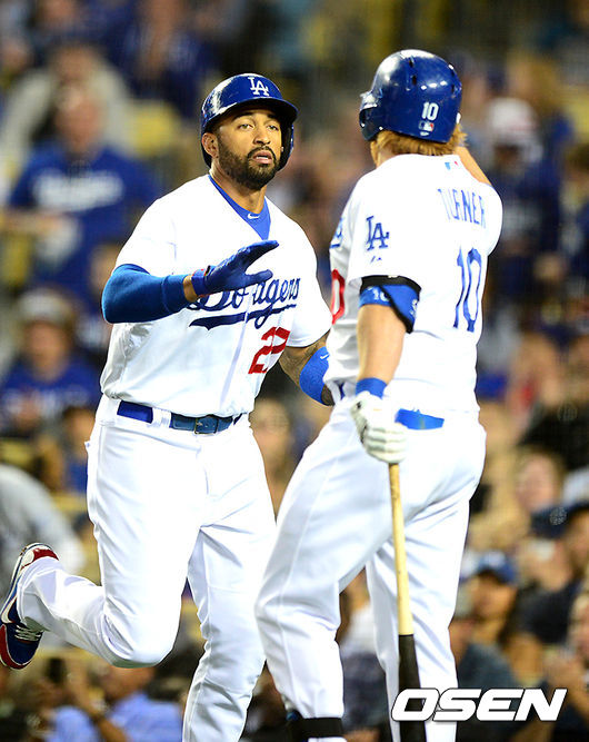2회말 무사 1,3루에서 다저스 맷 켐프가 유리베의 희생플라이에 태그업, 선취점에 성공하며 기뻐하고 있다.