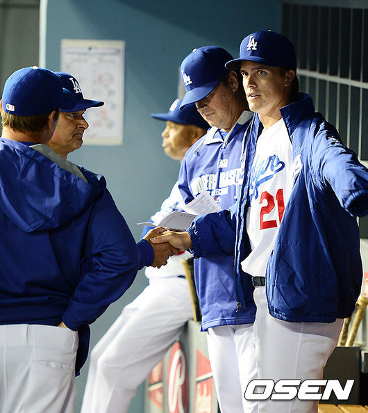 8회초 1사에서 마운드를 내려온 그레인키가 더그아웃에서 매팅리 감독의 격려를 받고 있다. 그레인키는 17경기 연속 '선발 5이닝 이상 2실점 이하'를 기록한 MLB 역사상 첫 번째 선수가 됐다. 종전 이 기록은 그레인키와 1916년의 페르디 숩이 가진 16경기였다. 공식 집계 기록은 아니지만 미 언론이 주목하는 '꾸준함'의 상징이 됐다.