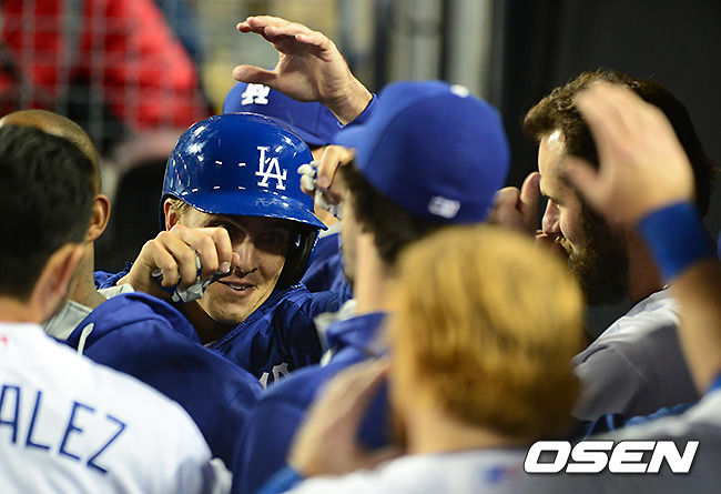 7회말 2사 2루에서 다저스 그레인키가 푸이그의 1타점 적시 3루타에 홈을 밟고 더그아웃에서 동료선수들과 기뻐하고 있다. /jpnews@osen.co.kr