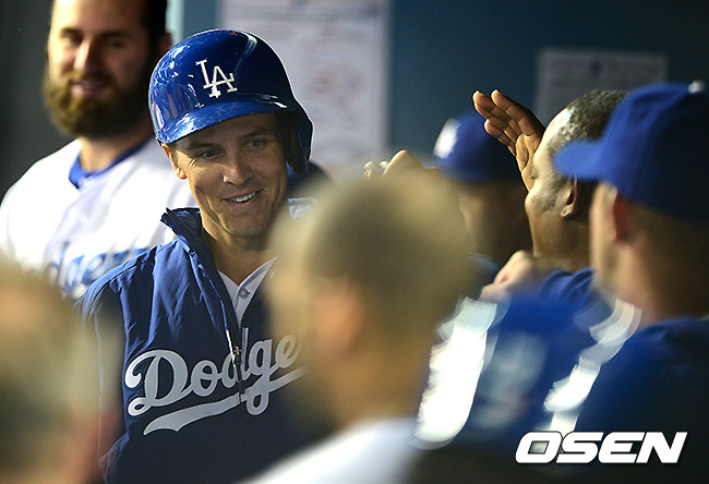 7회말 2사 2루에서 다저스 그레인키가 푸이그의 1타점 적시 3루타에 홈을 밟고 더그아웃에서 동료선수들과 기뻐하고 있다. /jpnews@osen.co.kr