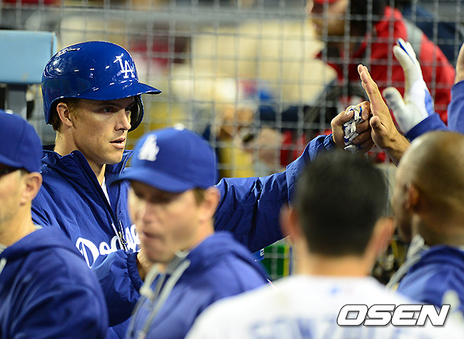 7회말 2사 2루에서 다저스 그레인키가 푸이그의 1타점 적시 3루타에 홈을 밟고 더그아웃에서 동료선수들과 기뻐하고 있다. 그레인키는 2사에서 2루타를 날렸다. /jpnews@osen.co.kr