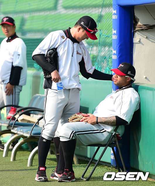 경기에 앞서 LG 이진영이 벨과 이야기를 나누고 있다.