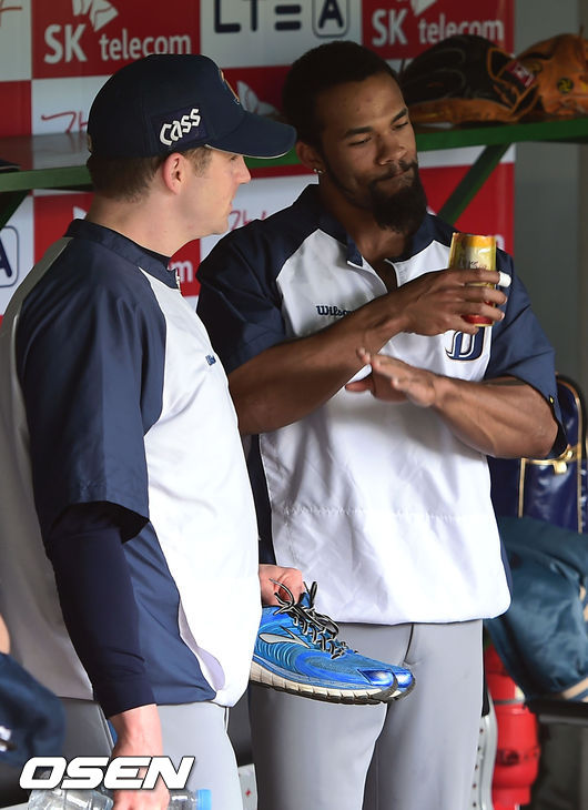 24일 오후 인천 문학구장에서 열린 2014 한국야쿠르트 세븐 프로야구 SK 와이번스와 NC 다이노스의 경기에 앞서 NC 테임즈가 홍삼액기스 음료를 마시고 있다.