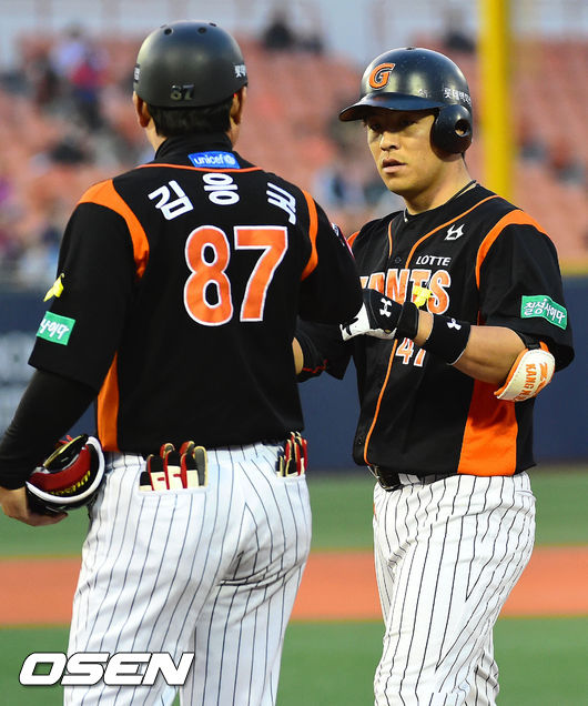 2회초 무사 주자 1루 좌익수 왼쪽 1루타를 날린 롯데 강민호가 1루에서 김응국 코치와 하이파이브를 나누고 있다.