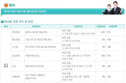 동부화재 채용 분야는 개인영업, 법인영업, 신사업, 보상관리, U/W, 상품업무로 근무지는 대부분 서울이다.