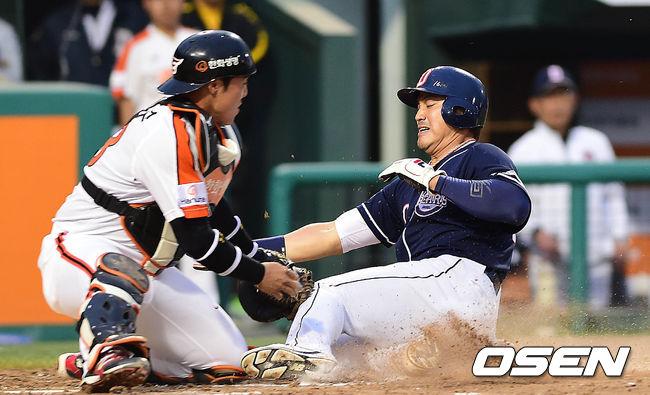 2회초 두산 공격 무사 1, 2루 상황 장민석의 번트 때 상대의 1루 송구 실책을 틈타 홈으로 내달린 2루 주자 홍성흔이 홈에서 한화 포수 김민수의 태그에 걸려 아웃되고 있다.