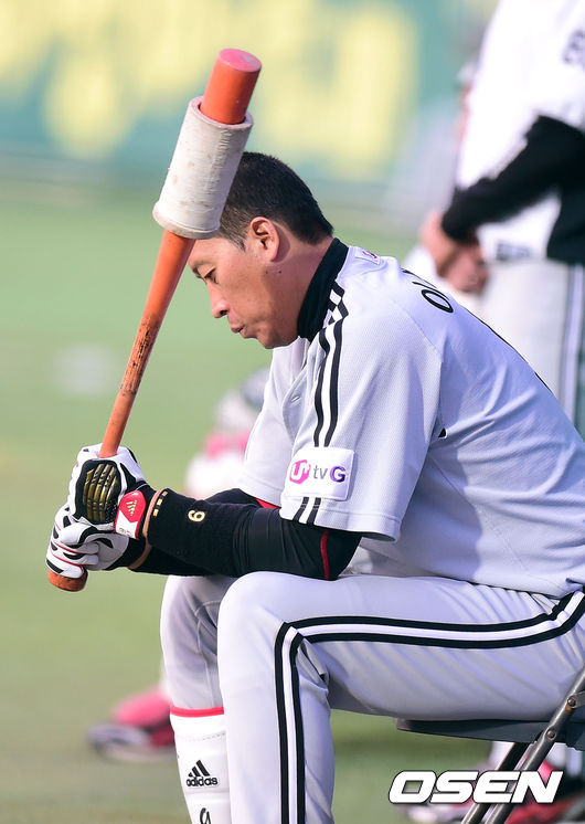 2회초 LG 이병규가 더그아웃에서 배트를 휘두르고 있다.