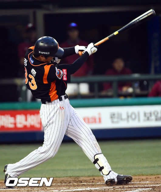 2회초 무사 만루 정훈이 2타점 적시타를 날리고 있다.