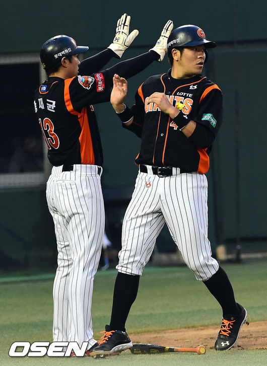 2회초 무사 만루 정훈의 2타점 적시타로 홈을 밟은 3루주자 황재균과 2루주자 강민호가 하이파이브를 나누고 있다.