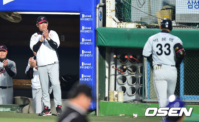 3회초 2사에서 LG 조계현 감독대행이 우중월 솔로홈런을 치고 더그아웃으로 들어오는 박용택에 박수를 보내고 있다.