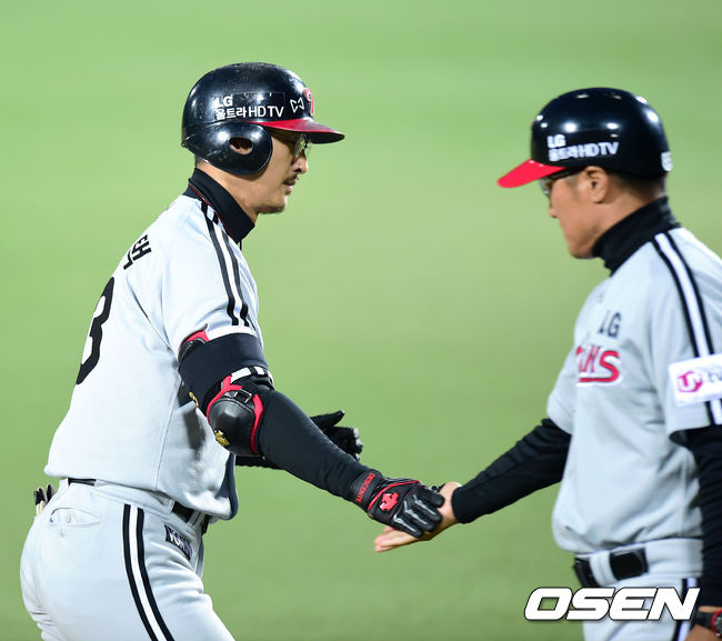 3회초 2사에서 LG 박용택이 우중월 솔로홈런을 치고 최태원 코치와 하이파이브를 하고 있다.
