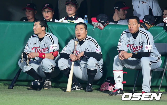 3회초 LG 이진영이 더그아웃에 앉아 경기를 바라보고 있다.